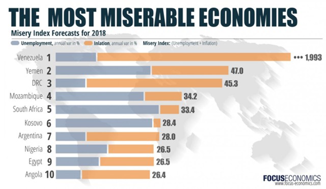 Самой несчастной экономикой в 2018 г. станет Венесуэла. Поскольку инфляция в 2018 г. составит около 2000%, уровень безработицы не имеет отношения к расчету индекса несчастья этой страны.