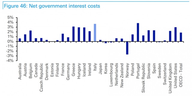 Соотношение долга к ВВП составляет 133%, причем только Греция, Япония и Ливан имеют более высокие коэффициенты долга к ВВП. Добавьте к этому дефицит в 2,4%, и вы получите ситуацию, в которой Италия должна потратить значительную сумму денег, выплачивая проценты по своим долговым обязательствам, как показывает вышеприведенный график. Это делает страну уязвимой к дефолту.