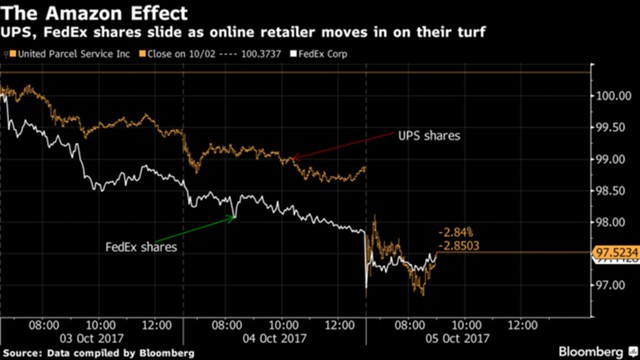 Акции компаний экспресс-доставки UPS и FedEx стали дешеветь на новости о том, что Amazon тестирует свой собственный сервис доставки.