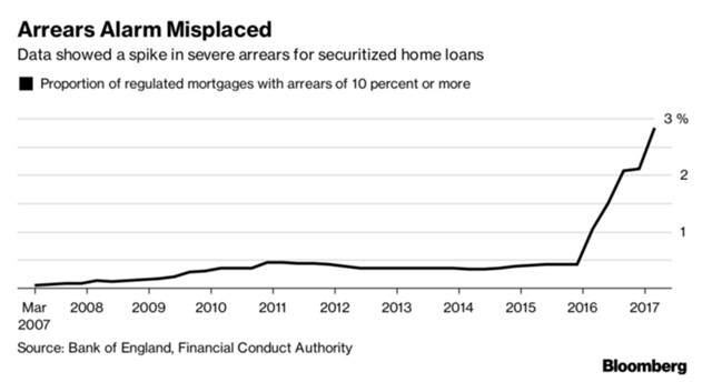 В Великобритании доля секьюритизированных (конвертированных в свободно обращающуюся ценную бумагу) ипотечных кредитов с объемом задолженности 10% и более выросла с 0,4% в конце 2015 г. до более чем 2,8% к весне этого года. Таковые данные совместного исследования Банка Англии и британского Управления по финансовому регулированию и надзору. При этом согласно информации Совета ипотечных банков Великобритании объем ипотечных кредитов с долей просрочки более 10%, наоборот, падал или же оставался неизменным.