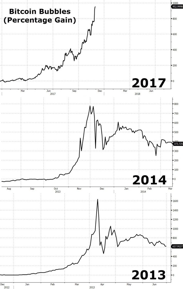 Отметим, что практически каждый взлет котировок биткоина сопровождался разговорами о «пузыре», о лихорадке и неминуемом конце всего этого действия. Однако на деле все пока происходит совсем иначе. Ниже приведем графики так называемых «пузырей» биткоина в предыдущие годы.