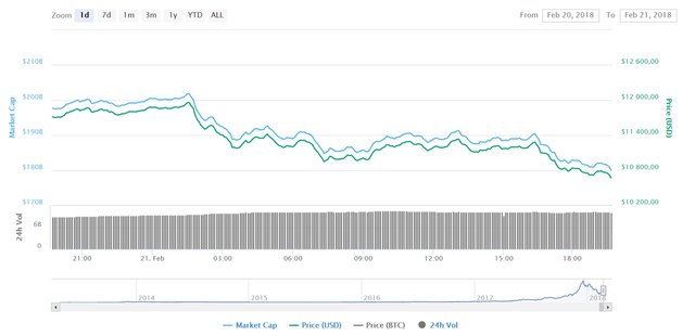 За последние сутки средневзвешенный курс Bitcoin (биткоин) упал на 9,15%. Рыночная капитализация составила $179,71 млрд. Средняя цена за один токен BTC равняется $10647,30.