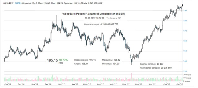 Цена акций Сбербанка неуклонно растет с июня 2017 г., когда прекратилось снижение его котировок до уровня августа 2016 г., продолжавшееся почти месяц.