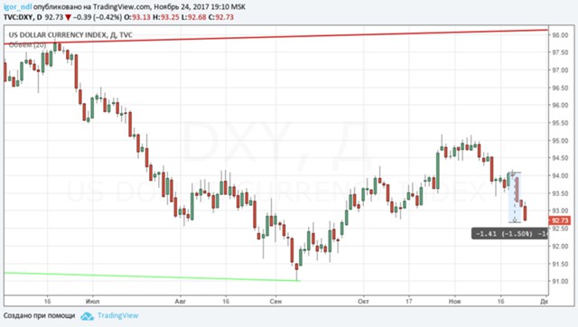 От максимумов текущей недели индекс доллара DXY потерял уже порядка 1,5%, а в паре с евро — примерно 1,7%.