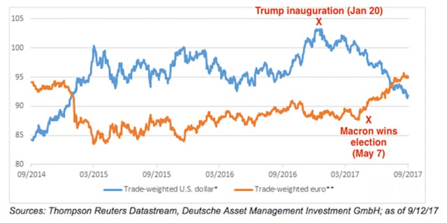 Команда по управлению активами Deutsche Bank утверждает, что согласно этим данным можно сделать предположение, что наибольшее влияние на динамику доллара и евро оказали такие политические события, как выборы в США и Франции.