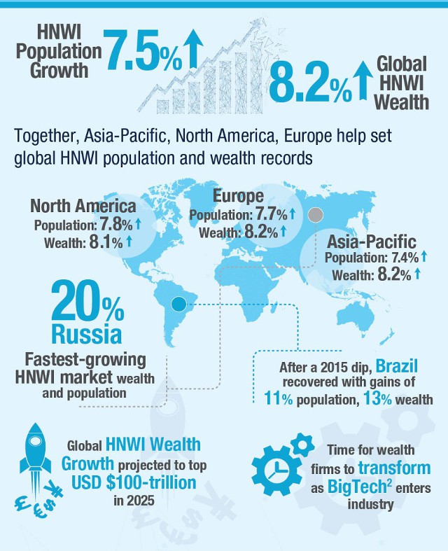 По оценкам консалтинговой компании Capgemini, за 2016 г. количество частных лиц, владеющих крупными состояниями (high net worth individuals, HNWI), увеличилось на 1,15 млн (+7,5%). Общий объем активов, которыми они владеют, вырос на 8,2%, достигнув рекордных $63,5 трлн.