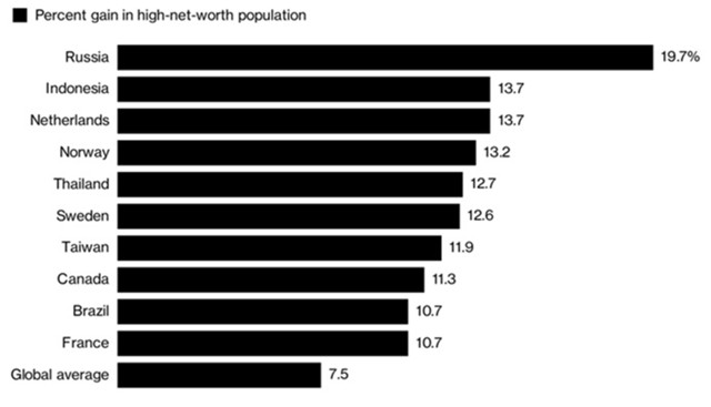 В частности, по данным доклада Capgemini Россия заняла первое место по росту числа миллионеров: за прошлый год их число в стране увеличилось на 30 тыс. (+19,7%), достигнув 182 тыс. человек. Также заметно выросло число обеспеченных людей в Индонезии (+13,7%), Нидерландах (+13,7%), Норвегии (+13,2%), Таиланде (+12,7%), Швеции (+12,6%), и ряде других стран.
