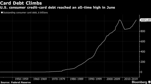 Москва, 8 августа — «Вести.Экономика». По данным Федрезерва США, объем задолженности американцев по кредитным картам в июне текущего года достиг рекордного уровня $1,021 трлн. Это даже больше, чем было зафиксировано в апреле кризисного 2008 г.