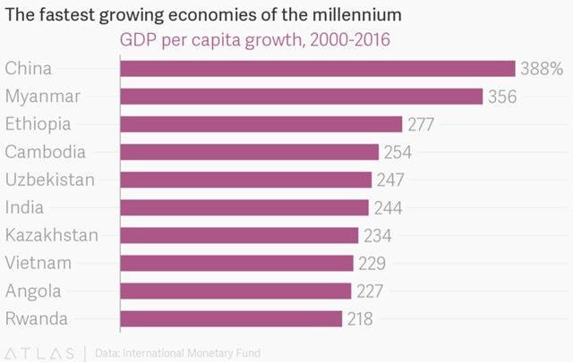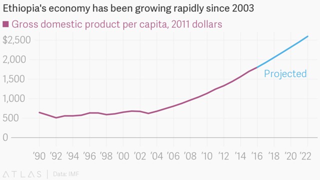 Но с тех пор случилось настоящее чудо. По оценкам МВФ, с 2000 по 2016 гг. Эфиопия с точки зрения ВВП на душу населения была третьей самой быстрорастущей страной в мире среди стран с населением в 10 млн и более человек. К 2011 г. уровень бедности в стране упал до 31%.