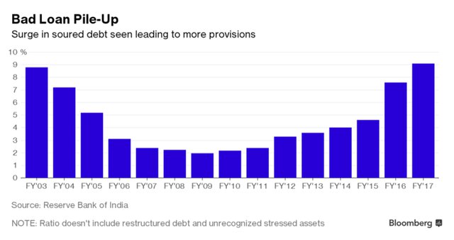 Подобной неэффективной работы не наблюдалось в секторе государственных банков Индии, с того момента как они были национализированы в 1969 г. в период правления премьер-министра Индиры Ганди. На протяжении многих лет эти банки были инструментом для коррумпированных лиц, помогающие вступить в сговор с крупными капиталистами. Всякий раз, когда они падают на дно, правительство возвращает им деньги за счет денег налогоплательщиков, только для того, чтобы они продолжали принимать плохие решения. В течение 11 лет три министра финансов — Пранаб Мукерджи, Паланиаппан Чидамбарам и Арун Джетли — вложили приблизительно 2,6 млрд рупий в государственные банки.