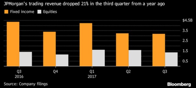 Доходы банка от торговли упали на 21%. Результат оказался хуже, чем снижение на 20%, которое в прошлом месяце прогнозировал гендиректор JPMorgan Chase Джейми Даймон. Доходы от торговли ценными бумагами с фиксированным доходом упали на 27% в соответствии с прогнозом аналитиков. Доходы от торговли акциями снизились на 3,6%.