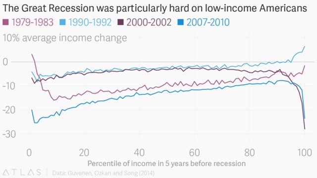 Что сделало Великую рецессию таким тяжелым периодом для бедных? Фатих Гувенен, один из экономистов, который работал над исследованиями, говорит, что это может быть связано с величиной шока, а не с коренным изменением некоторых аспектов экономики. Модель четырех проанализированных рецессий показывает, что чем хуже рецессия, тем больше диспропорция между последствиями для богатых и бедных.