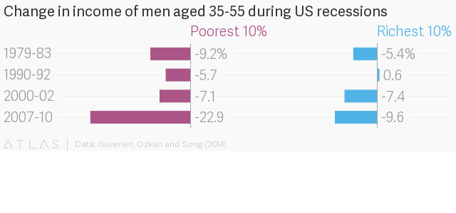 Исследователи вычислили средний доход 35-55-летних мужчин за пять лет до спадов и во время спадов. Их анализ показывает, что среди беднейших 10% работников наблюдалось снижение среднего дохода на 23% во время Великой рецессии – вдвое больше, чем во время спадов за последние 40 лет.