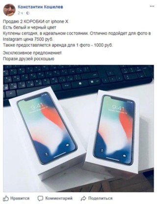 В соцсети «ВКонтакте» появилось объявление о продаже коробок от нового смартфона iPhone X. Автор записи сообщает, что упаковка находится в «идеальном состоянии» и пригодится тем, кто хочет поделиться новостью о «покупке» смартфона в Instagram. За то, чтобы произвести впечатление на подписчиков, придется отдать 7500 руб.