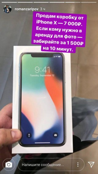 Коробку от новой модели iPhone предлагает купить также маркетолог Роман Зарипов, с подачи которого в марте начали сдавать в аренду огромные букеты для селфи. Он назначил меньшую цену в 7 тыс. руб. В качестве альтернативы можно арендовать коробку для фото на 10 минут. Эта услуга обойдется в 1,5 тыс. рублей.