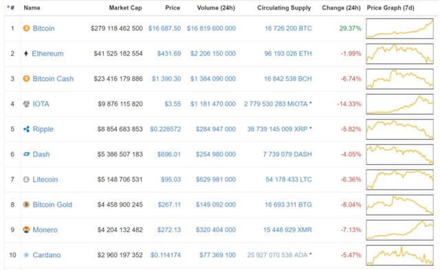 По данным ресурса CoinMarketCap, одна единица криптовалюты в данный момент стоит $16 687. На азиатских биржах курс выше. Так, на Bithumb биткоин достиг отметки $19239. Определенно, показатель этой биржи оказывает большое влияние на средневзвешенный курс, поскольку на большинстве западных бирж биткоин продолжает стоить меньше.