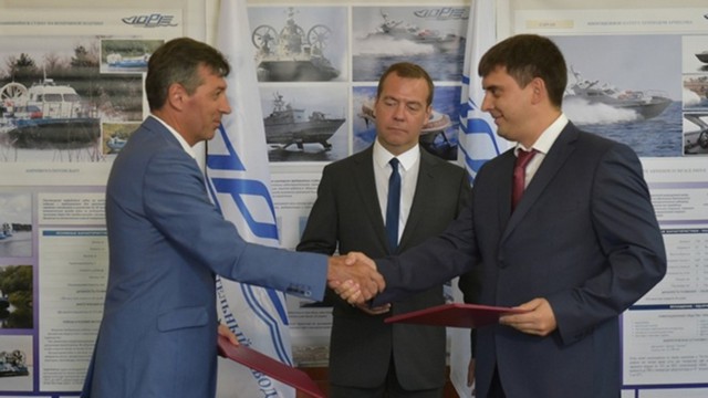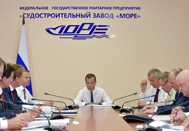 Перед совещанием Дмитрий Медведев осмотрел один из цехов ФГУП «Судостроительный завод «Море», а также проследил за ходом работ по созданию малого ракетного корабля «Штурм» (проект 22800).