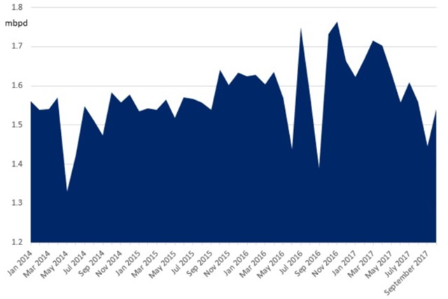 Перипетии, связанные с добычей нефти, также ухудшили прогноз Норвегии на 2017 год. В этом году объем производства снижен (данные за январь-октябрь указывают на 1,605 млн баррелей в сутки против прогноза в 1,621 млн баррелей в сутки). Во многом это было связано с трудностями в отношении месторождения Голиаф, первое задействованное норвежское месторождение в Баренцевом море. Голиаф был закрыт на месяц в сентябре 2017 года на ремонтные работы; однако в октябре прошла еще одна незапланированная остановка, поскольку норвежские власти приказали ENI прекратить деятельность ввиду серьезных нарушений в электросистеме платформы. На фоне перебоев в подаче электроэнергии, будущее платформы повисло в воздухе, поскольку норвежские власти провели тщательный анализ, до того как производство могло бы быть возобновлено, восьмой раз с момента его начала в начале 2016 года.