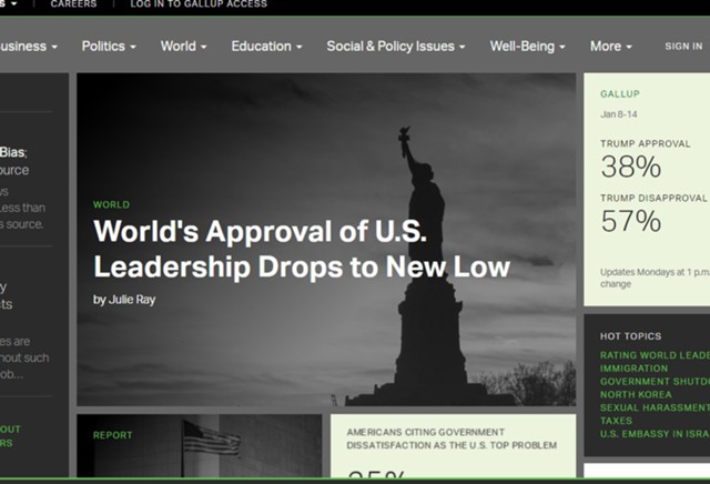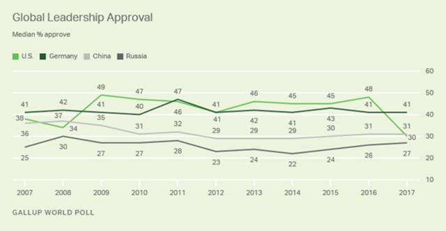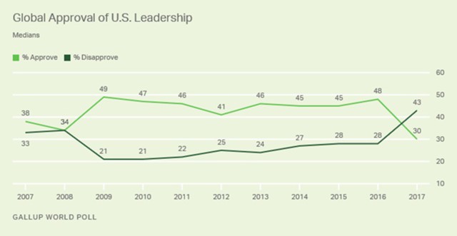 Лишь 30% опрошенных за пределами США одобряют действия американских властей. В 2016 г. «рейтинг одобрения» США, по данным Gallup, составлял 48%.