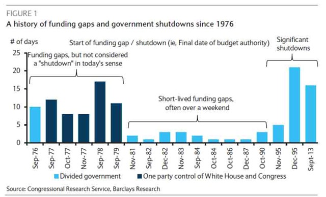Это хорошая новость, потому что, хотя приведенная выше диаграмма показывает, что закрытие происходит с некоторой регулярностью, их последствия в значительной степени политизированы, особенно если закрытие недолговечно. Кроме того, отсутствие текущих доходов для миллионов государственных служащих будет оказывать давление на конгрессменов и будет оказывать на них политическое давление, подталкивая к достижению компромисса. В результате shutdown должен продолжаться в течение нескольких недель или более, чтобы иметь значительные экономические последствия.
