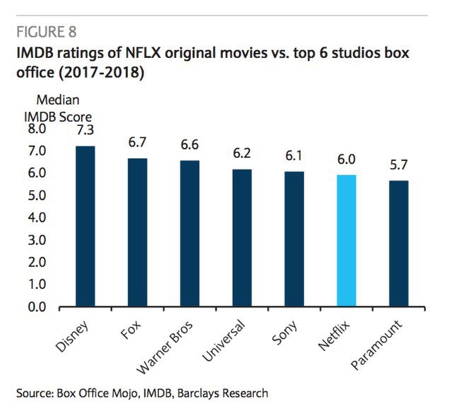 Аудитория оригинальных фильмов Netflix в этом году будет соотноситься с кассовыми сборами в районе $4 миллиардов. По мнению Barclays, в глазах зрителей фильмы Netflix по-прежнему «значительно хуже» по качеству, чем большинство студийных релизов.