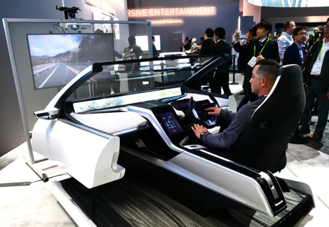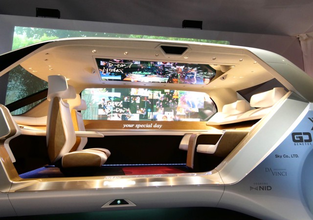Кроме того, салон беспилотного Panasonic оборудован многоканальной аудиосистемой с 22 динамиками, двумя боковыми мониторами диагональю 55 дюймов, а также 77-дюймовым дисплеем в потолке.