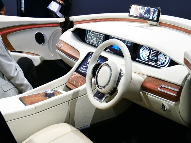 Отделка салона выполняется из специальных полимерных материалов нового поколения, разработанных на основе патентованной технологии Panasonic. Они могут очень реалистично имитировать текстуру дорогих пород дерева, металла или кожи. Задняя подсветка элементов интерьера может менять цвета в зависимости от ситуации, например информируя водителя об опасности или создавая атмосферу в салоне.