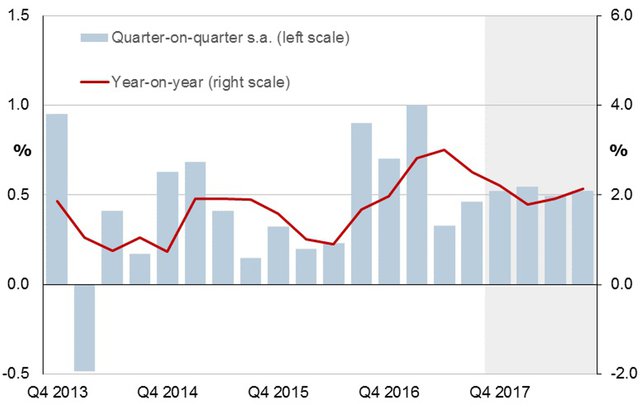 Согласно данным Статистического управления Португалии ВВП вырос на 2,4% в IV квартале по сравнению с тем же периодом в 2016 г. и на 0,7% в III квартале.