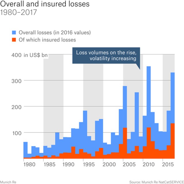 Застрахованные потери в 2017 г. достигли $135 млрд, это наиболее высокий показатель за период с 1980 по 2017 гг. Служба NatCatSERVICE, входящая в состав Munich Re, зафиксировала 710 природных катастроф в 2017 г.