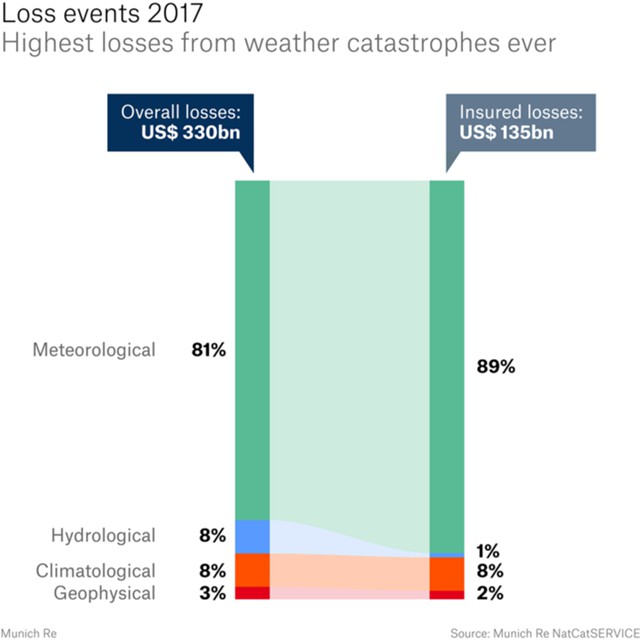 Примерно 93% от всех масштабных катастроф в мире в 2017 г. были вызваны природными факторами. Негативный эффект для макроэкономики пострадавших регионов составил $320 млрд, из них потери были застрахованы на $133 млрд. Это сделало 2017 самым дорогим годом за современную историю в плане понесенного ущерба от природных катастроф.
