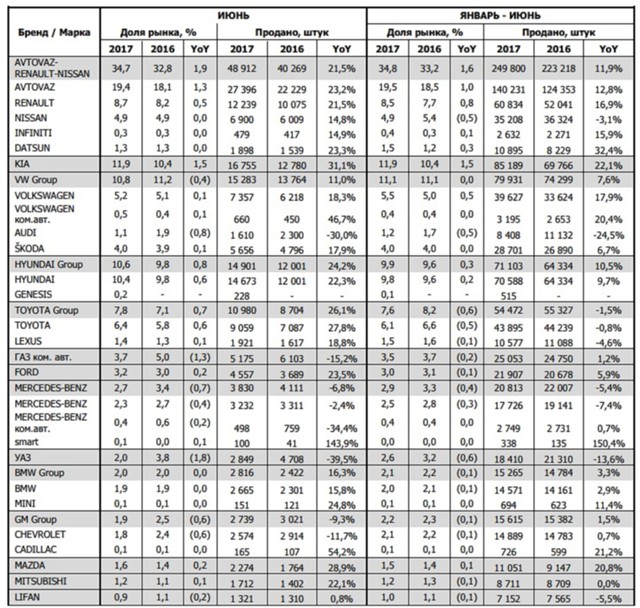 В 2017 г. в январе-июне было продано 718,529 тыс. автомобилей, что на 6% больше, чем в аналогичном периоде прошлого года.