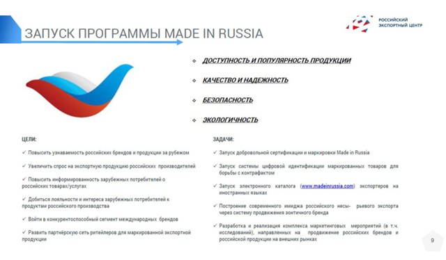 В Минпромторге РФ и РЭЦ также сообщили о развитии и основных результатах проекта Made in Russia («Сделано в России»), направленного на продвижение данного бренда и торговой марки. В рамках приоритетного проекта Правительства РФ «Международная кооперация и экспорт» Минпромторг в 2017 г. выделил на эти цели 370 млн руб.
