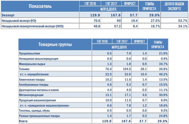 «Несырьевой неэнергетический экспорт России в первом полугодии 2017 г., по расчетам РЭЦ, составил 57,2 млрд долл., что на 18,7% больше по сравнению с первым полугодием 2016 г. В физическом выражении несырьевой неэнергетический экспорт тоже продемонстрировал положительную динамику, увеличившись на 6,4%.