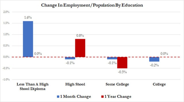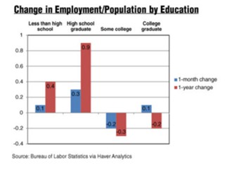 Теперь, имея данные, можно сравнить с недавними данными ФРБ Нью-Йорка и найти то же самое: в течение 1-месячного и 1-летнего периодов коэффициент занятости населения к общей численности населения для работников со «степенью колледжа» или «степенью бакалавра и выше» уменьшился или остался прежним, причем наибольшее увеличение как за 1-месячный, так и за 1-летний периоды было отмечено для тех, кто «не имеет диплома средней школы» или является «выпускником средней школы».