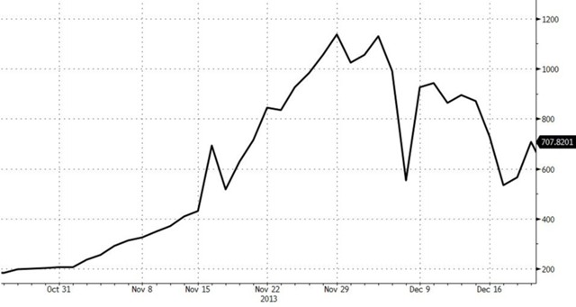 После событий апреля цена биткоина колебалась в районе $120, пока в конце ноября цены внезапно не выросли до $1150. Однако к середине декабря цена упала и вновь преодолеть планку $1 тыс. не могла на протяжении четырех лет.