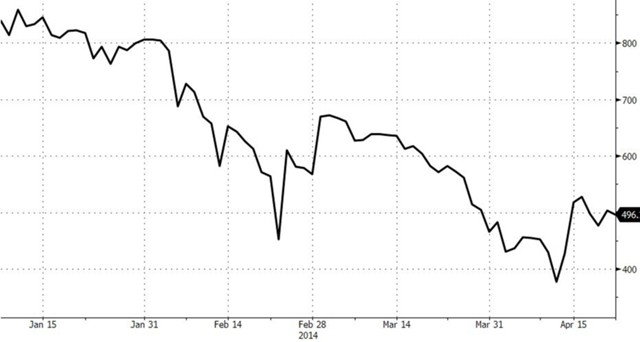 Биткоин неуклонно рос в январе и феврале, когда внезапно упал почти на 50% с $867 до $439. Это случилось, после того как сервис Mt.Gox потерял более 700 тыс. биткоинов (средства клиентов и самой биржи) в результате атаки «двойного вывода». Такой масштаб потери поразил даже самых пессимистичных наблюдателей. Очевидно, что биржа абсолютно неплатежеспособна и не может рассчитаться с клиентами.