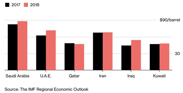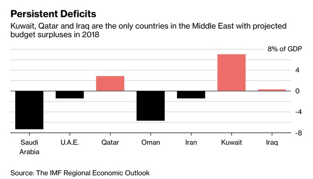 По данным МВФ, совокупный дефицит в Совете сотрудничества стран Залива, блоке из шести стран, в который входит Саудовская Аравия, Объединенные Арабские Эмираты и Катар, упадет примерно до 2% ВВП в 2019 г. с почти 11% в 2016 г.