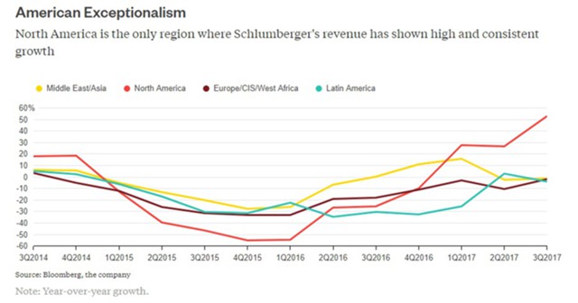 Выручка Schlumberger с начала этого года выросла в годовом выражении на 7,5% до $22,3 млрд. Особо хороших финансовых показателей компании удалось добиться на территории Северной Америки. Это единственный регион, где доходы концерна показали значительный, устойчивый рост.