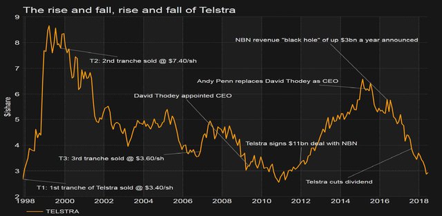 За последние несколько лет крупнейшая телекоммуникационная компания Австралии потеряла более половины своей рыночной капитализации. Котировки Telstra в настоящее время находятся вблизи абсолютных исторических минимумов, показанных в 2010 г,, а также ранее в 1998 г.