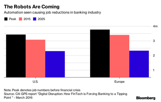 Руководство банка Cititgroup в прошлом году тоже говорило о грядущем значительном сокращении рабочих мест в банковской сфере, правда временной промежуток в прогнозе был гораздо шире. Согласно отчету финансового института за март 2016 г., за период с 2015 по 2025 гг. из-за автоматизации процессов в сфере банковского бизнеса 30% работников будут уволены. В США сократят 770 тысяч штатных сотрудников и еще около 1 млн работников — в Европе.