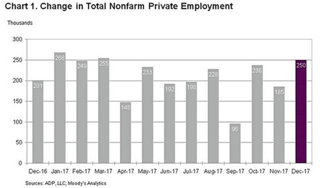 Экономисты, опрошенные Reuters, прогнозируют рост числа рабочих мест в частном секторе США на 185 тыс. в декабре после увеличения на 221 тыс. месяцем ранее. По оценкам аналитиков, общее количество рабочих мест в экономике страны увеличилось на 190 тыс., показатель безработицы остался на уровне 4,1%.
